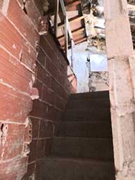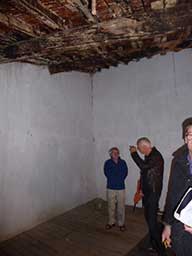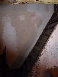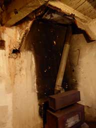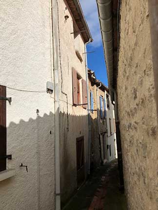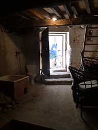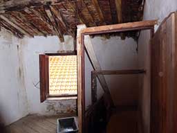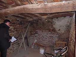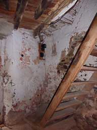 ![]() The arch in the back wall of the ground floor. Beautiful old beams and stone walls to preserve ![]() 6 rue de la Sardane, narrow house with 2 windows opposite wall of church ![]() Front door with the mail slot inviting the curious ![]() All the conveniences of home right inside the front door! ![]() Electrical service ... I think there is only one circuit. Stairs to second floor ![]() Stairs to third floor ![]() Third floor hayloft. The ceiling is hand-tied bamboo between the joists, more beautiful old beams ![]() High ceiling on 3rd level makes it possible to build a terrace in the roof ![]() Once a fireplace ... maybe again? Second floor |