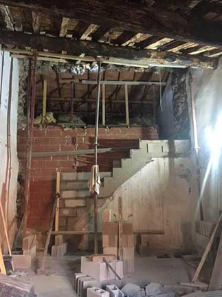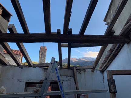 What’s the Plan? Joining the two houses doubles the size … dollhouse no more! My goal is to create one integrated structure full of light, connecting on all levels, adding bedrooms, bathroom and toilet, fireplace, second terrace and storage. All exterior changes to my house require approval of the Mairie, and allowable changes to historic houses is very limited. Enlarging windows is allowed only in the vertical direction (Catalan houses didn’t have horizontal windows). No new windows permitted. To add a terrace, it must be built into the roof (not at the edge of the roof with a railing). Skylights ok. APPROVED! Interior changes require no permit or inspections, although there are building standards that must be followed. I am opening the ground floor arch on the to create a grand entrance from my current house. Adding a glass entry door and interior glass wall will create a light-filled bedroom on the ground floor. Vestibule for bikes and firewood. New large closet for washer/dryer, water heater and new full-size refrigerator. On the second level, tear out interior wall to create a large open room. Open the small window, in the vertical direction, for French doors and small balcony to make a light-filled room for dining and lounging. Restore the fireplace for ambience (and hopefully heat). Add master bedroom with skylights, second toilet, and bathroom on third level. Demolish mitoyene (common) stone wall 1 meter thick to gain space for stairs to new rooftop terrace on fourth level. Build support for roof that was supported on both sides by the stone wall. Build terrace set into the roof in the attic space with views to the Mediterranean and Pyrenees.